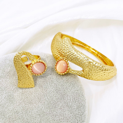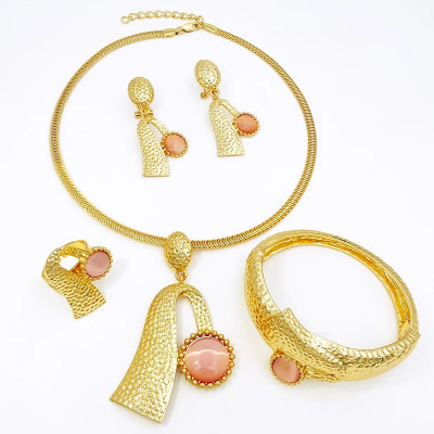 مصنوع من العقيق الإيطالي الوردي. يتضمن هذا الطقم الرائع أربع قطع مميزة و هي قلادة، أقراط، إسورة وخاتم، مصممة لإضافة لمسة من الفخامة والجمال على كل إطلالة. فإن هذا الطقم مثالي كهدية في مناسبات الزفاف أو كهدية مميزة للأحباء.